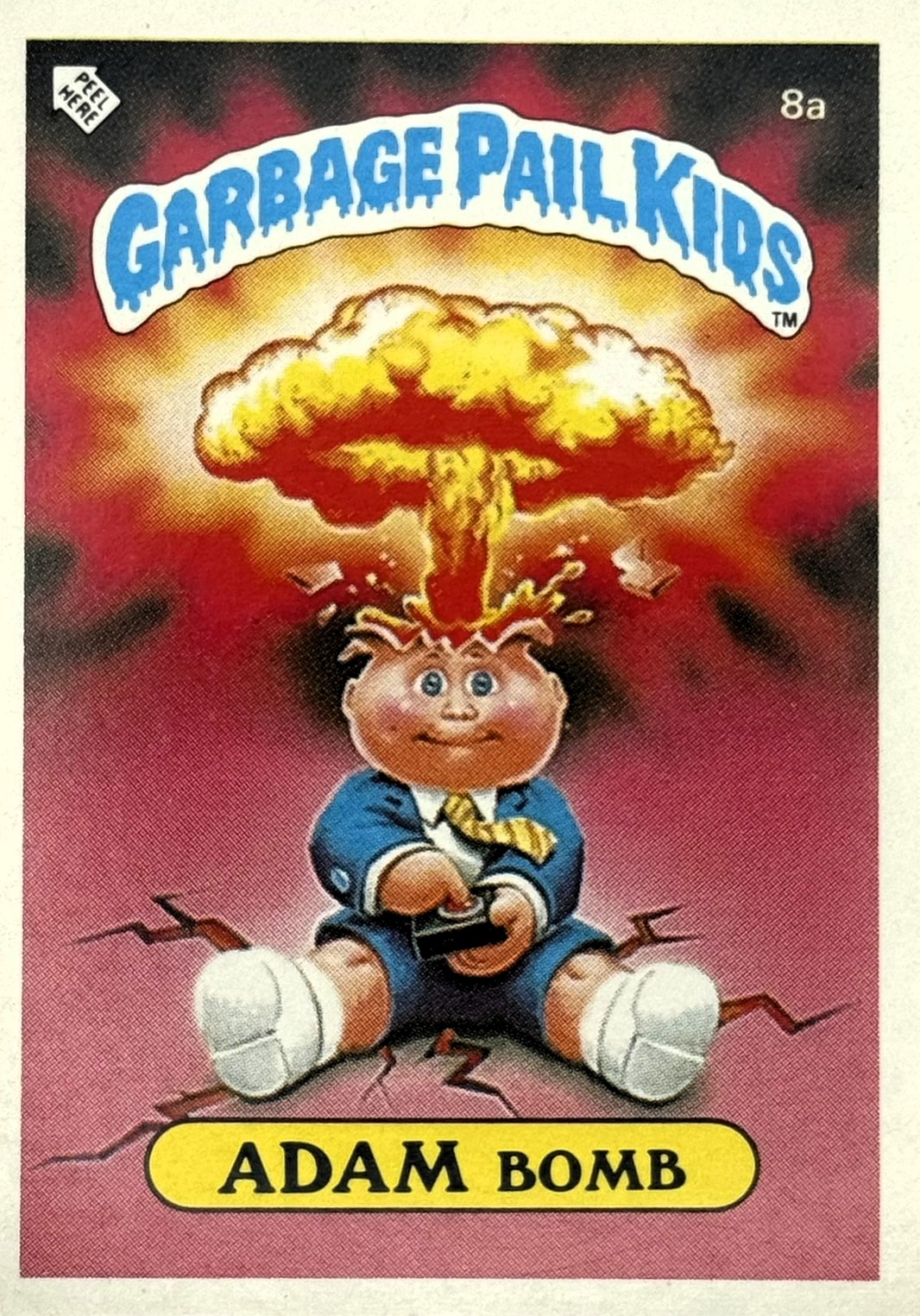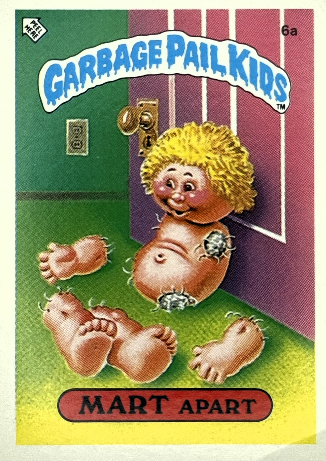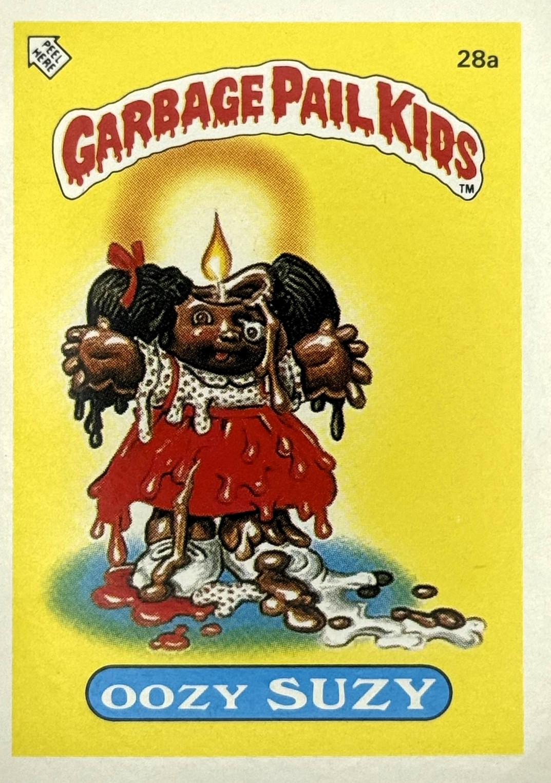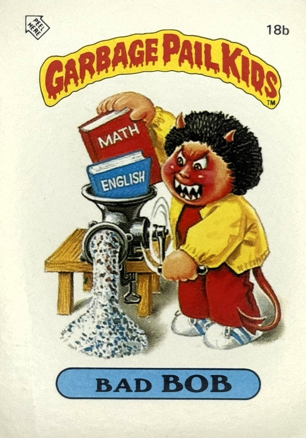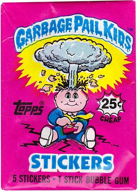 Röd text med gul bakgrund till "Garbage Pail Kids"-loggan.