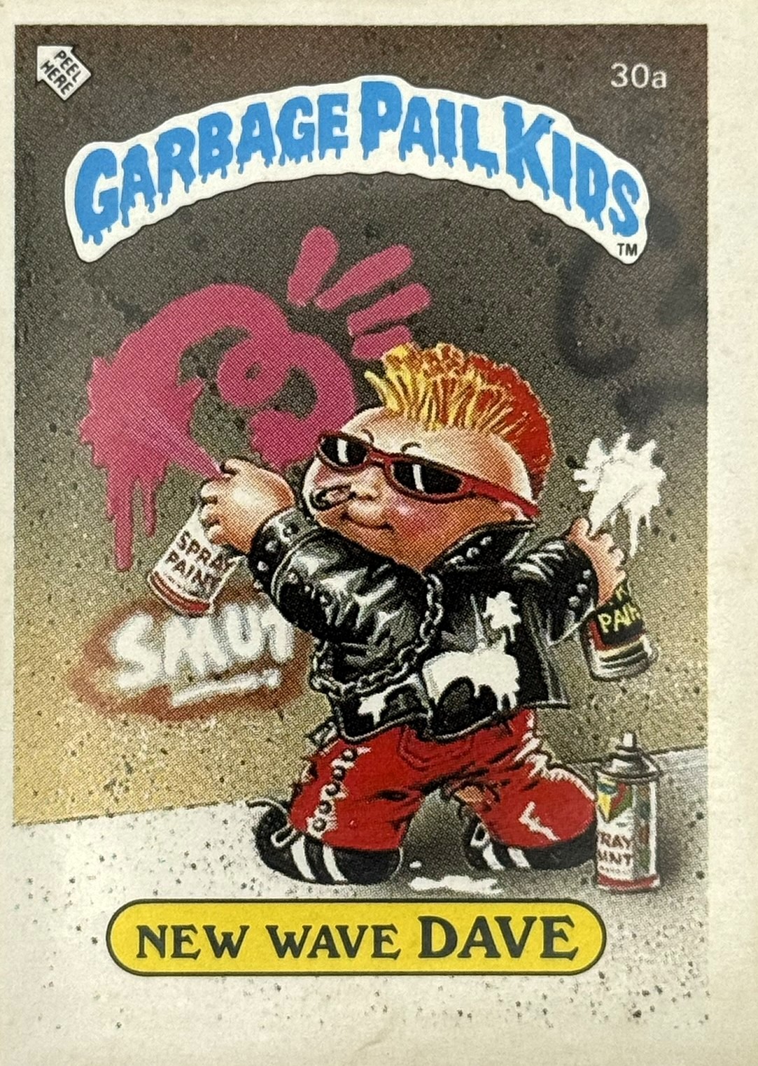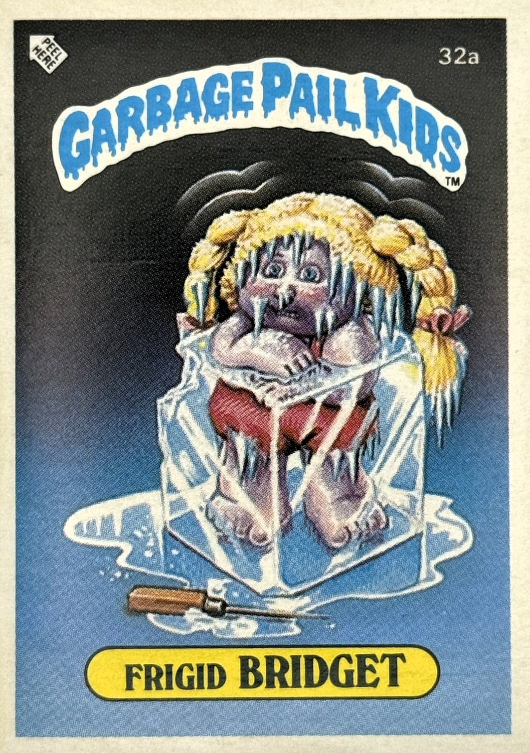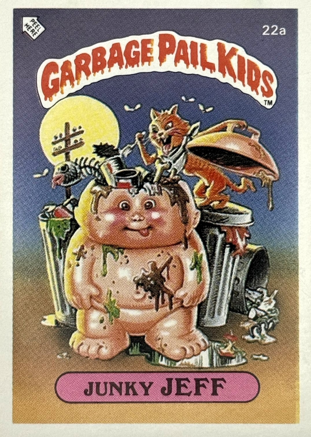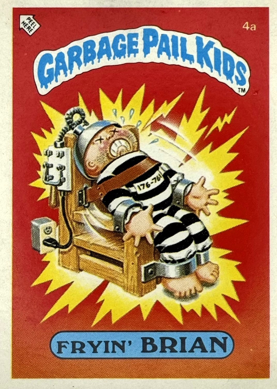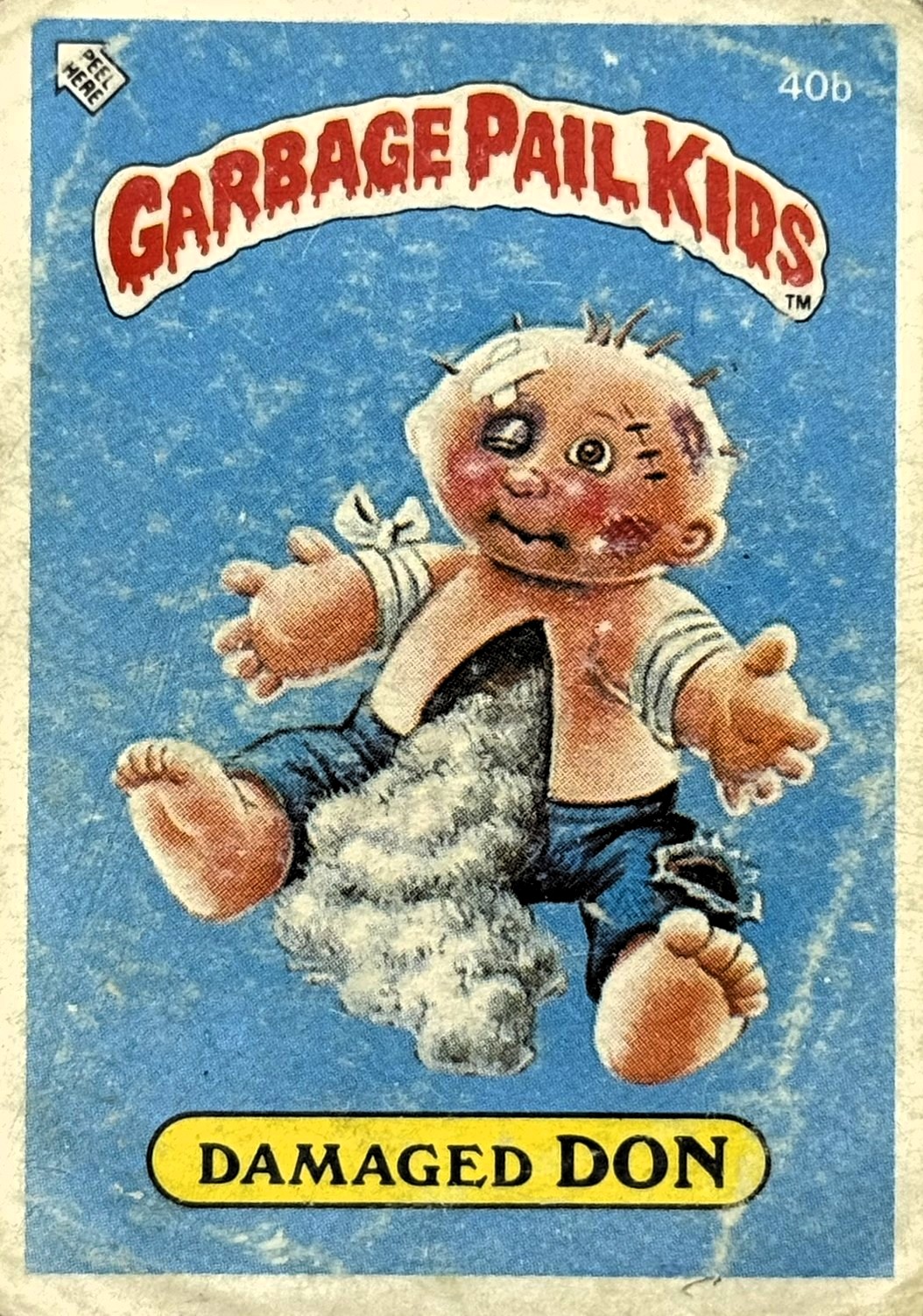 Röd text med gul bakgrund till "Garbage Pail Kids"-loggan.